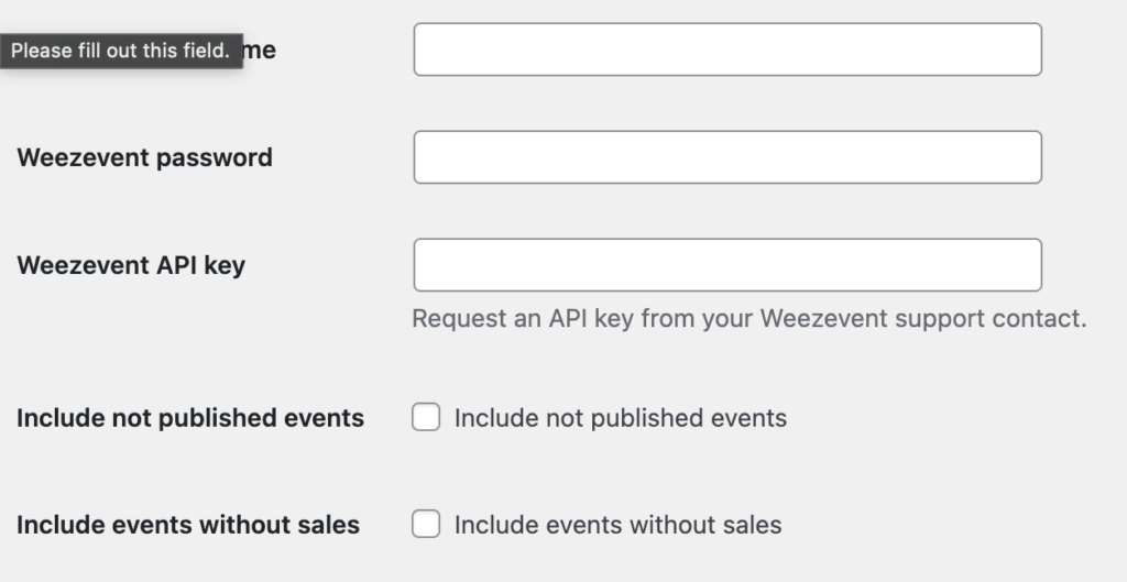 Enter your Weezevent username, password and API key: